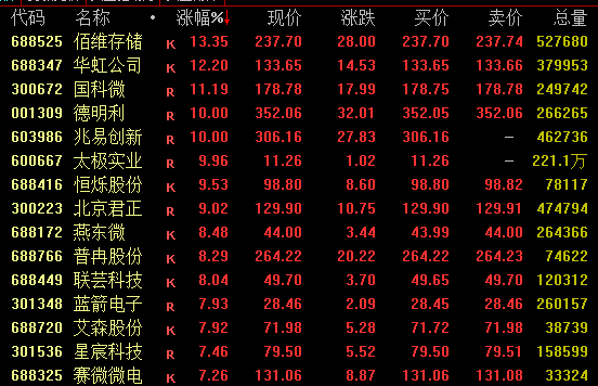 半导体板块午后强势拉升,存储芯片、MCU芯片等表现亮眼。截至收盘,佰维存储涨超13%,续创历史新高;华虹公司、国科微等涨超10%,德明利、兆易创新双双涨停,北京君正等涨超9%。